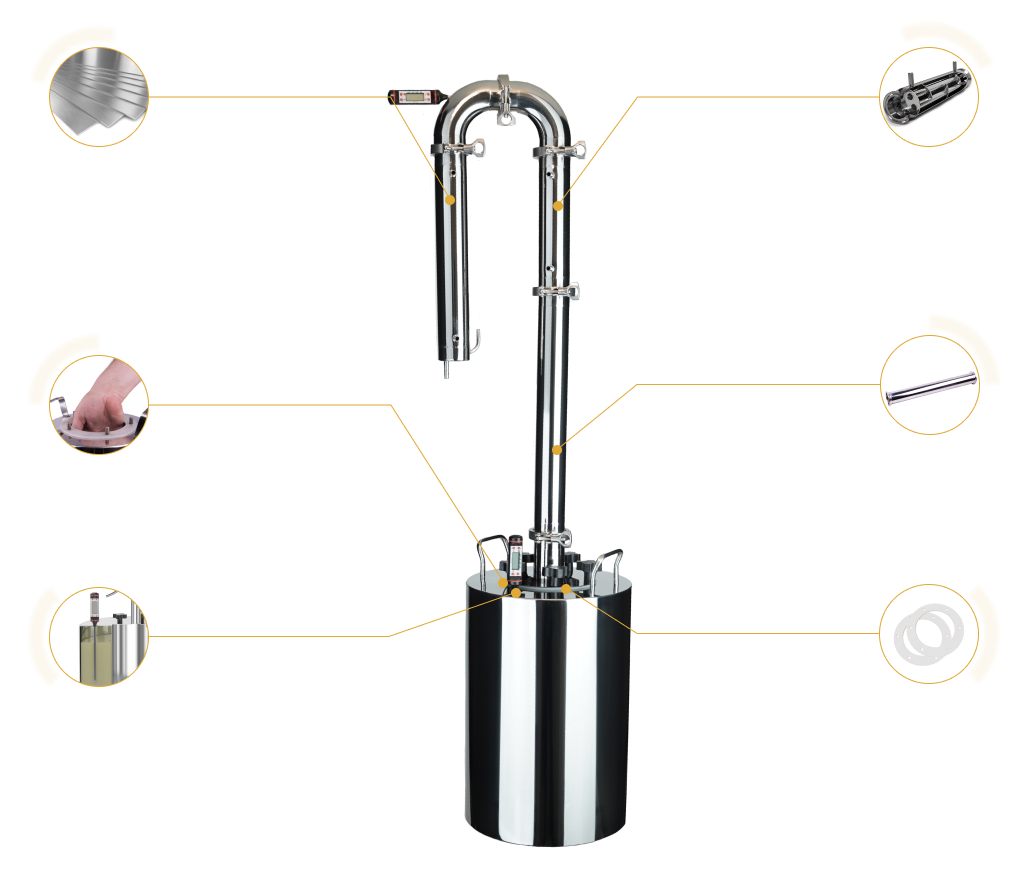 6 режимов работы обусловлены продвинутой системой охлаждения: позволяет гибко регулировать поток воды, подаваемый на охладитель и дефлегматор, тем самым определяя продукт, который собирается на выходе. Комбинируйте подачу воды в разных вариациях, подавая её на элементы колонны. Получайте, как спирт-сырец, так и фруктовый дистиллят.